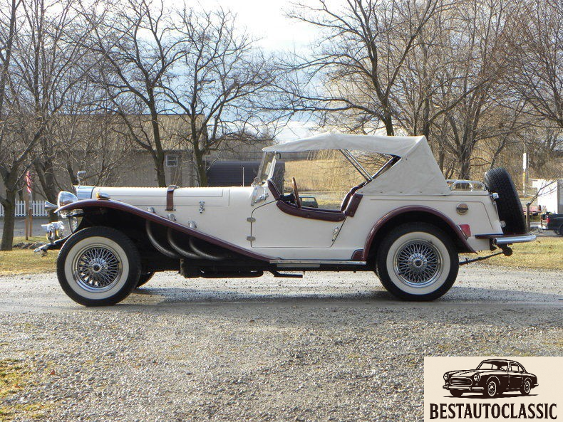 This SSK replica of the "Famous Mercedes was factory built in1984. Gazelle built a quality product with the Ford V6 engine with automatic transmission and this car special equipped with air condition. Body is clad in burgundy and creme over a fiber glass body with long classic hood and chrome pipes. This one low mileage. Engine rebuilt runs and drives excellent. A wonderful fun Roadster with SSK type chrome pipes. Equipped with burgundy interior white top and side curtains. Excellent detail and well maintained fun car to drive.