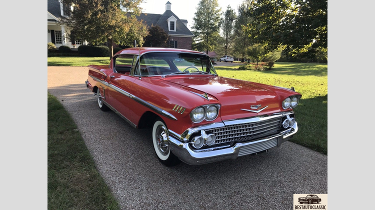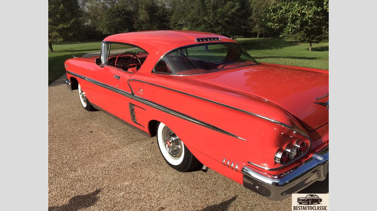 This is a very attractive Rio Red 1958 Chevrolet Impala. It has the 348ci engine with a 4bbl carburetor. Exterior - Overall the car is looks very nice. The paint is base/clear with a high level of shine. There is some minor peeling of clear coat around the door edges and trunk edges. There is also an area next to the trunk on the left rear panel where the paint has separated. The area is about one/ half inch by eight inches. It is only noticeable by looking closely.The chrome on both bumpers is nice and the side trim looks very good. All four hubcaps are excellent with new spinners. The chrome around the side windows is fair to good. All glass is clear with some very minor bubbling. In summary, the car looks impressive from ten feet but a close inspection shows what I have described. There is no body damage and very few, if any, stone chips. There is no rust. Interior- The interior is in excellent condition with no tears,stains or scrapes.The carpet is clean and looks like new.The headliner is excellent and the dash,steering wheel and interior trim are very good. All gauges work as do the radio,heater,windshield wipers and clock. All lights work including turn signals. Trunk- The trunk is clean and mat is in good condition.The inner fenders are painted black rather than the correct single stage rio red. Car has a jack and good spare. Engine- The engine compartment is clean but driver quality.The air cleaner has been restored nicely. Underbody- The underbody is driver quality but is not overly dirty. When the car was restored, the underneath was painted black rather than the correct red oxide. Mechanical- Starts easily and runs smoothly. Transmission was rebuilt less than 500 miles ago. Engine has good power and the car drives nicely. The exhaust system is good and the car does not smoke.