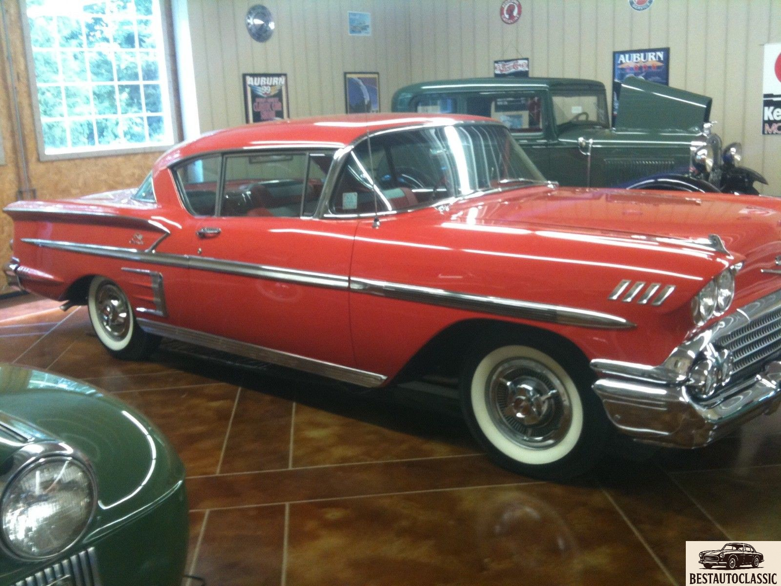This is a very attractive Rio Red 1958 Chevrolet Impala. It has the 348ci engine with a 4bbl carburetor. Exterior - Overall the car is looks very nice. The paint is base/clear with a high level of shine. There is some minor peeling of clear coat around the door edges and trunk edges. There is also an area next to the trunk on the left rear panel where the paint has separated. The area is about one/ half inch by eight inches. It is only noticeable by looking closely.The chrome on both bumpers is nice and the side trim looks very good. All four hubcaps are excellent with new spinners. The chrome around the side windows is fair to good. All glass is clear with some very minor bubbling. In summary, the car looks impressive from ten feet but a close inspection shows what I have described. There is no body damage and very few, if any, stone chips. There is no rust. Interior- The interior is in excellent condition with no tears,stains or scrapes.The carpet is clean and looks like new.The headliner is excellent and the dash,steering wheel and interior trim are very good. All gauges work as do the radio,heater,windshield wipers and clock. All lights work including turn signals. Trunk- The trunk is clean and mat is in good condition.The inner fenders are painted black rather than the correct single stage rio red. Car has a jack and good spare. Engine- The engine compartment is clean but driver quality.The air cleaner has been restored nicely. Underbody- The underbody is driver quality but is not overly dirty. When the car was restored, the underneath was painted black rather than the correct red oxide. Mechanical- Starts easily and runs smoothly. Transmission was rebuilt less than 500 miles ago. Engine has good power and the car drives nicely. The exhaust system is good and the car does not smoke.